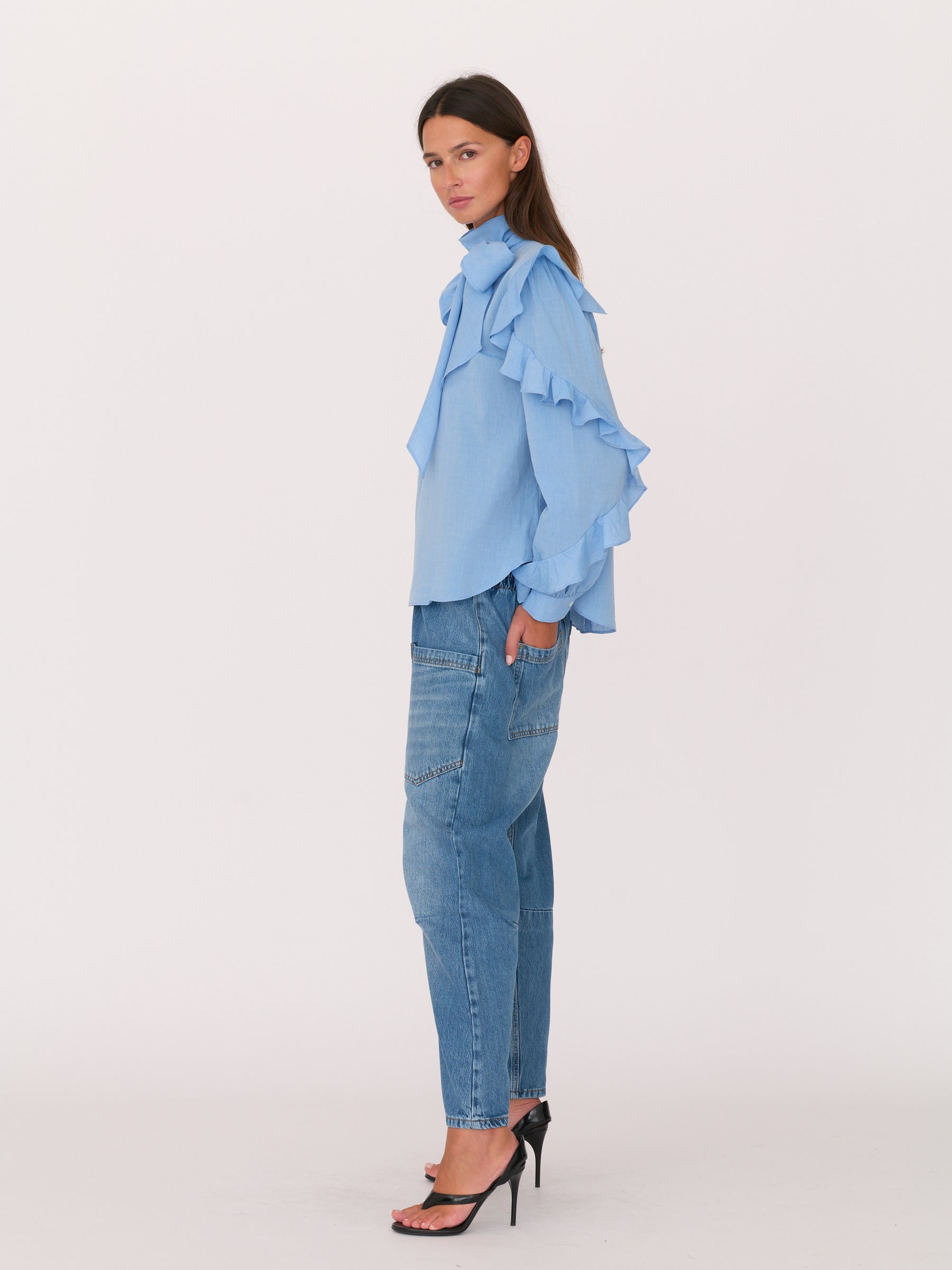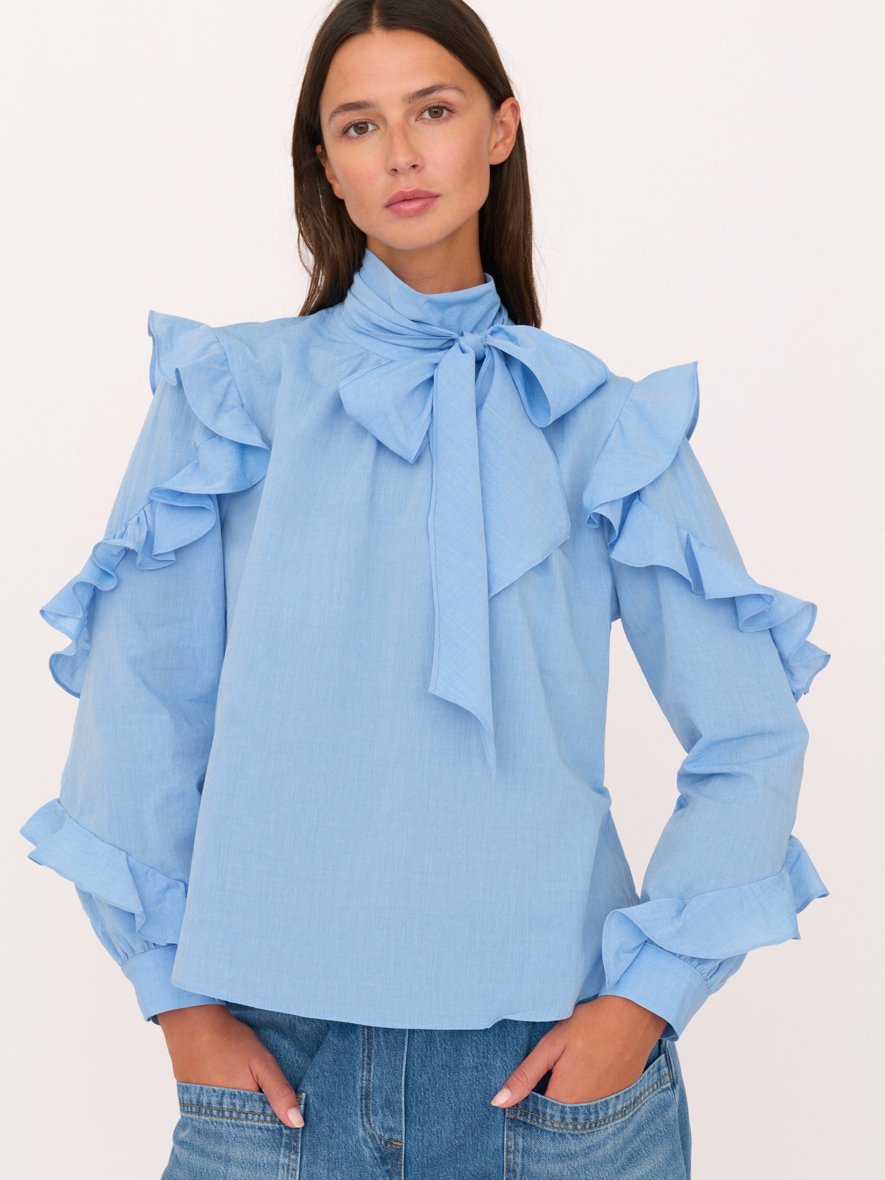 The Akani blouse is a soft, romantic essential with an easy, modern feel. Designed with cascading ruffles along the sleeves and a relaxed silhouette, it features a long neck tie that can be styled at the front or draped at the back. Lightweight and fluid, it moves beautifully from day to evening and pairs effortlessly with denim or tailored pieces.