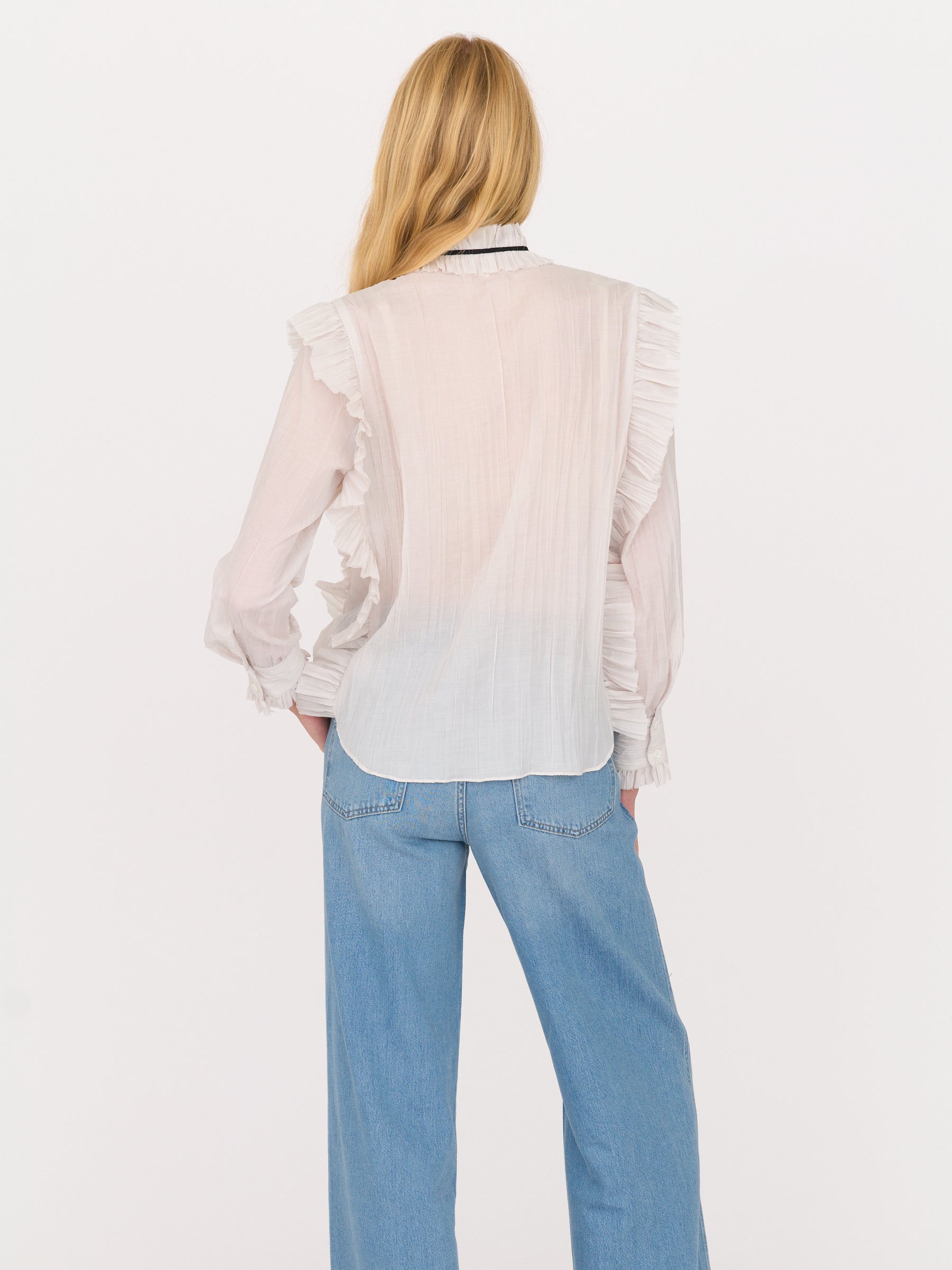 Crafted in our airy Japanese crinkle fabric, the Seville Shirt pairs romance with everyday ease. Designed with a delicate pearl top button and a slim grosgrain tie at the neck for a soft, feminine finish. The raw-edge ruffle detailing is intentionally cut to naturally fray with wear—light and subtle—and can be easily trimmed as needed to maintain a clean look. Dry clean only.