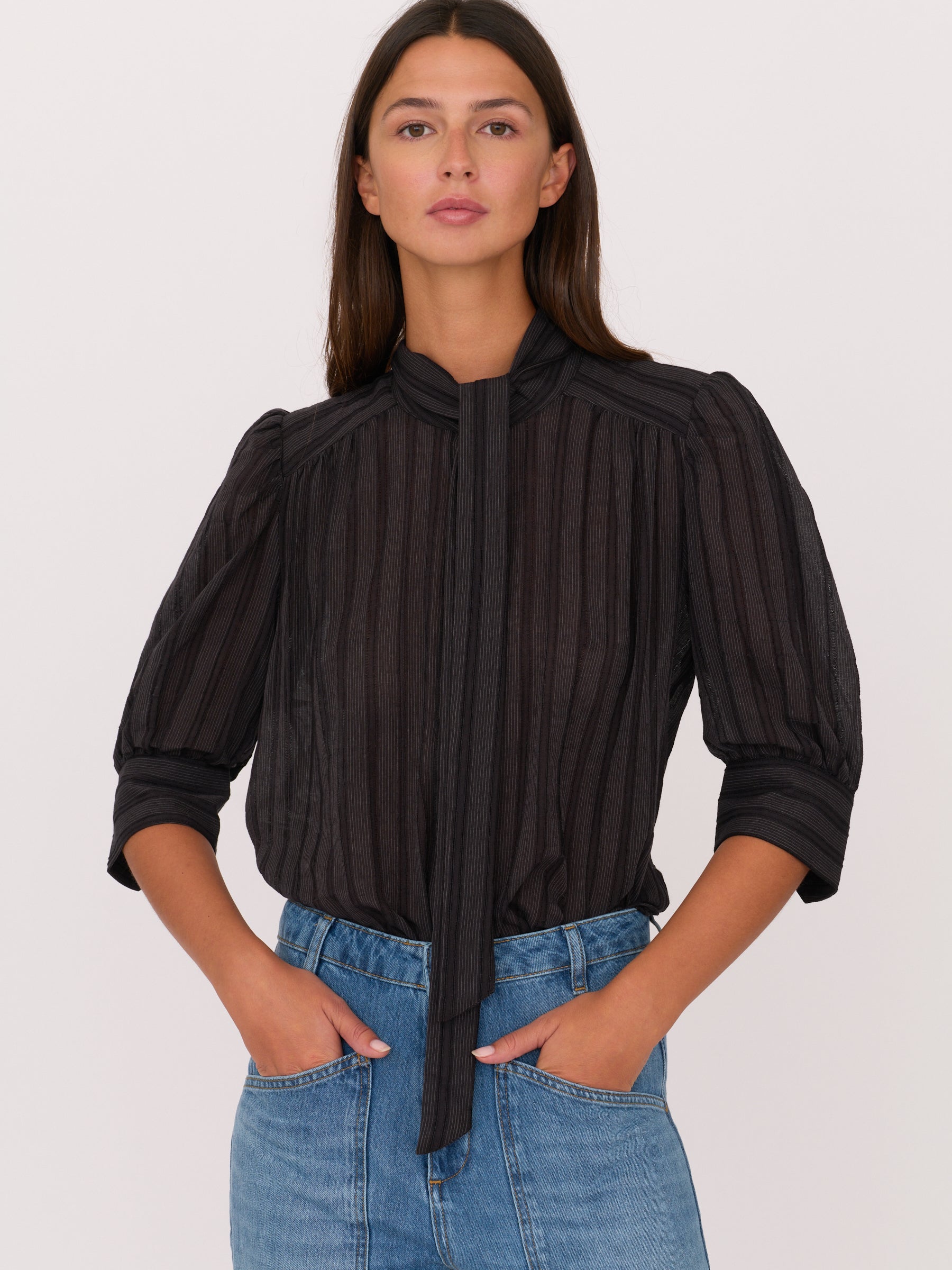 A feminine striped cotton blouse with soft volume and a removable neck tie. Wear it loose, tied in a bow, or without for a clean finish. Light and versatile, it moves easily from day to night. We love this light cotton fabric that is slightly sheer.