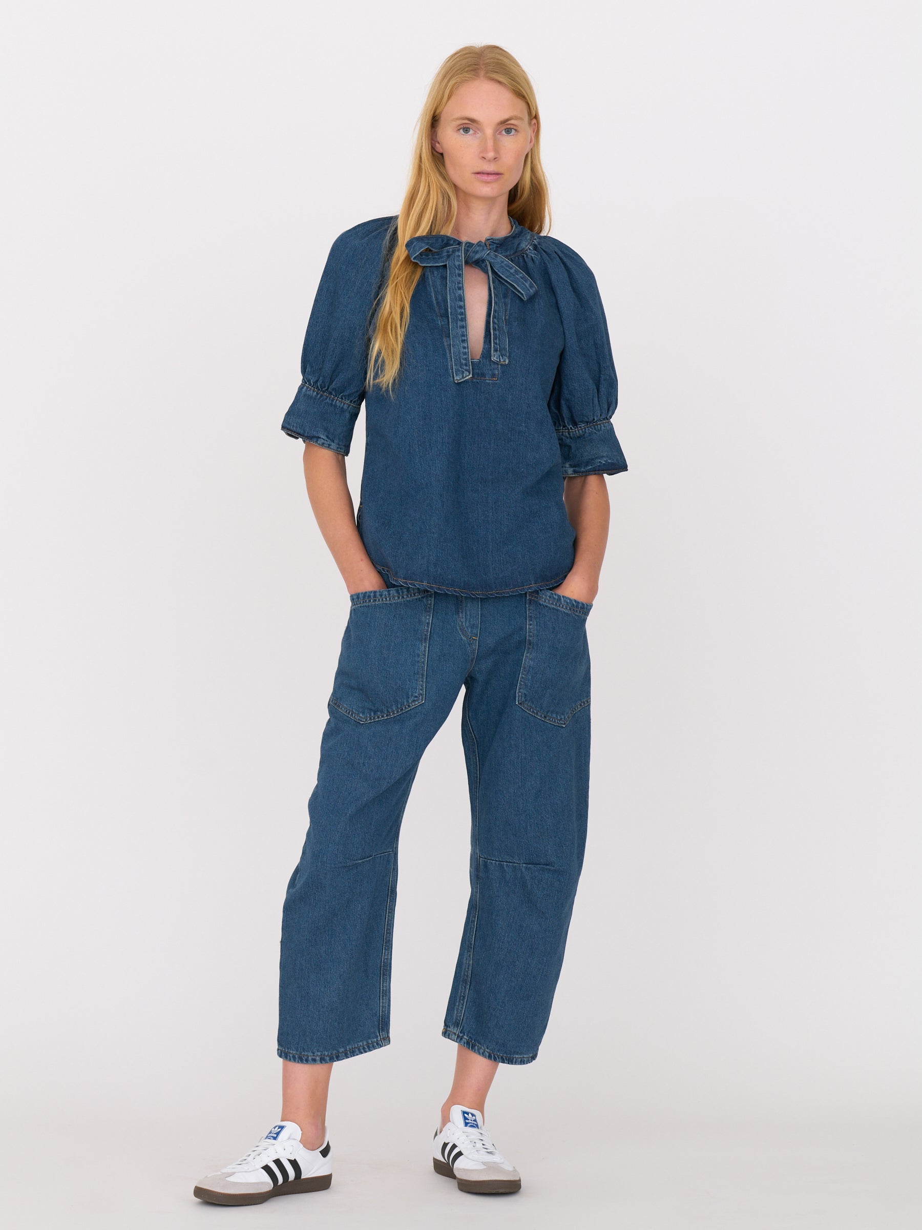 A slightly structured denim shirt with a clean tie neckline and a feminine silhouette, that sits perfectly when tucked or worn loose.