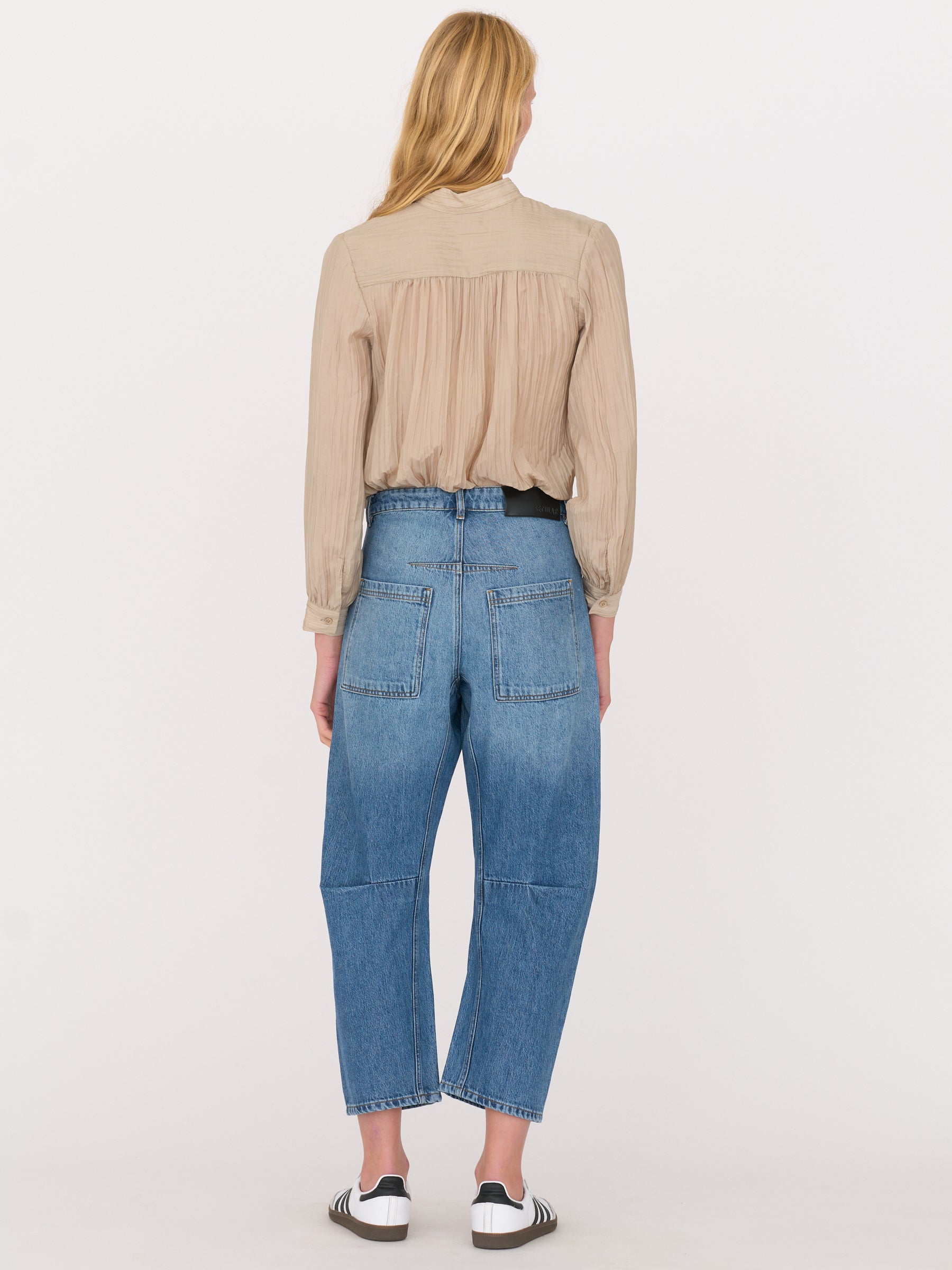 A relaxed, slightly rounded jean designed with a subtle barrel-leg shape. Features front and back patch pockets, soft knee seaming, and an easy cropped length that hits just above the ankle.