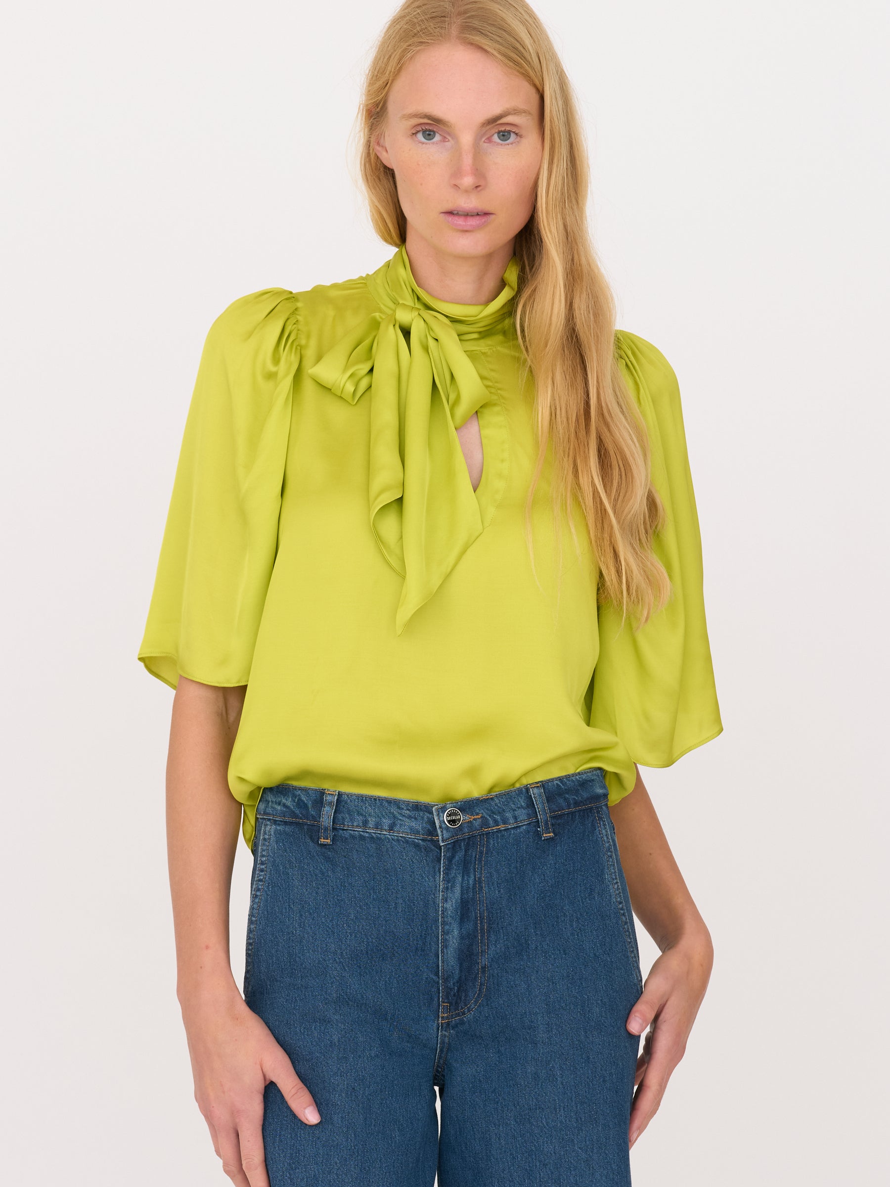 A fluid Italian viscose blouse with a soft, effortless drape. Designed with a tie-neck detail, softly structured shoulders, and wide, relaxed sleeves for an elegant silhouette. Finished with a back neck invisible zipper