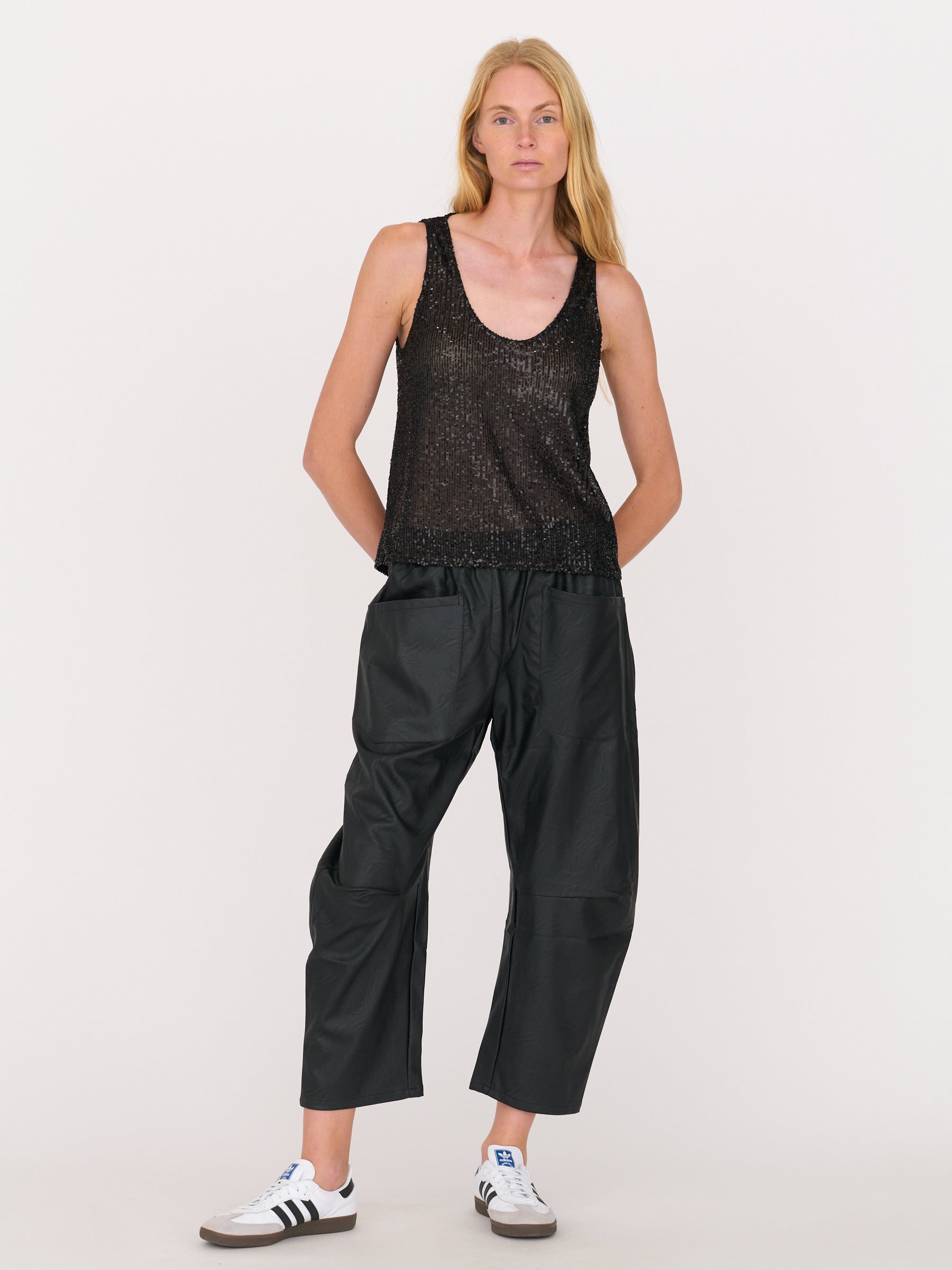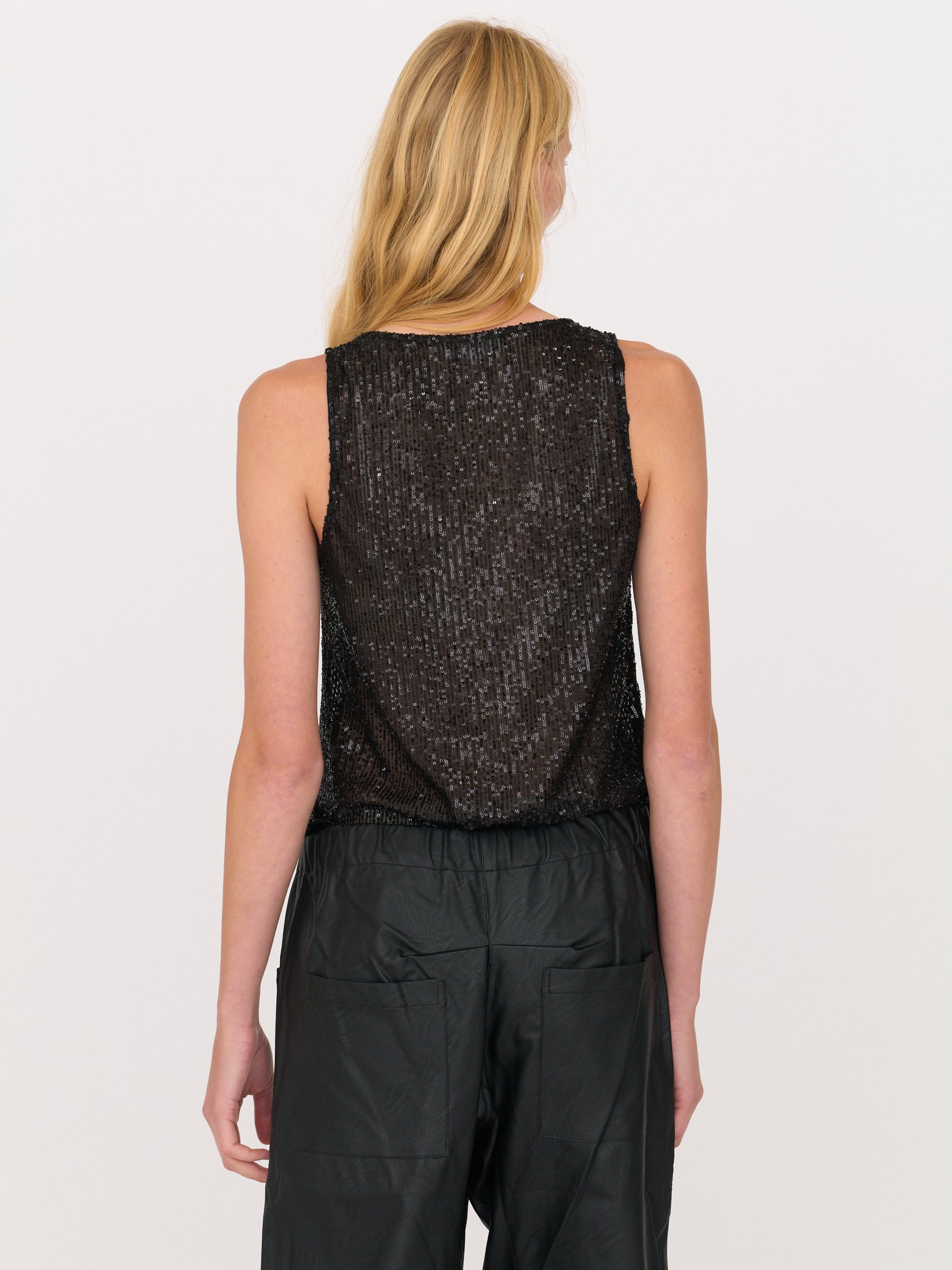 A sexy sequin tank with an easy, fluid drape. The Selma brings subtle shine in deep black with a scoop neck. Polished, effortless, and perfect from day to night.