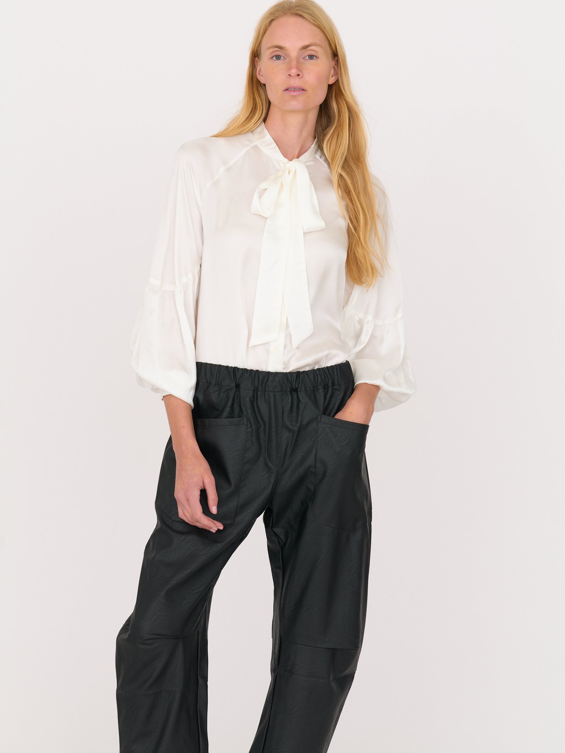 A soft, effortless bow-tie blouse cut in fluid Italian viscose. Designed with a relaxed drape, raglan seams, and voluminous sleeves that taper softly at the cuff, push them up or wear them down. Feminine, and easy to style—finished with a long tie that can be knotted or left loose.