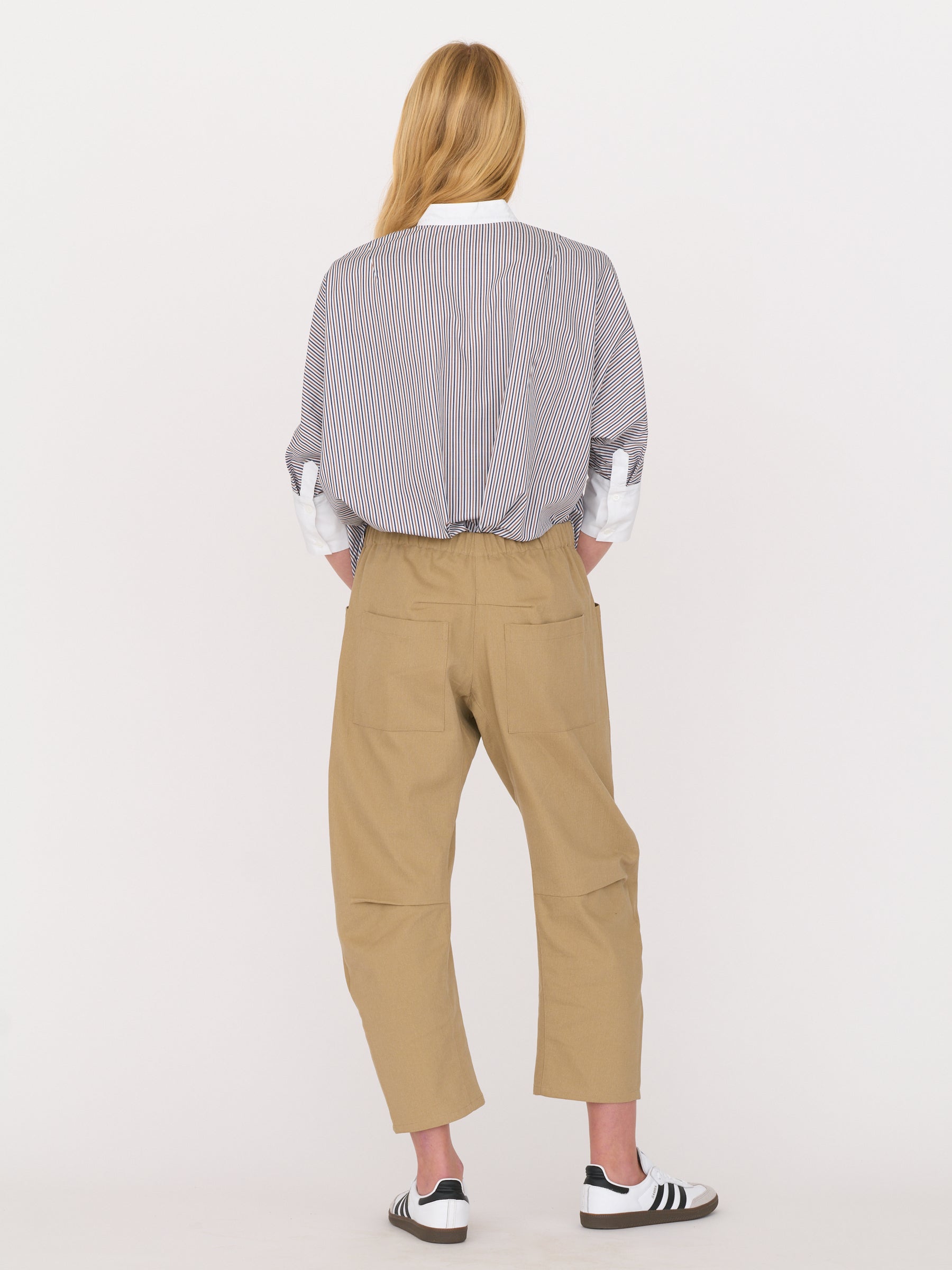 Our signature barrel pant, reimagined in an Italian cotton twill with a softly structured feel. Designed with an easy elastic waistband, relaxed curved leg, and oversized patch pockets that lend a modern, utilitarian edge. Effortless, versatile, endlessly wearable — dress them up or down season after season.