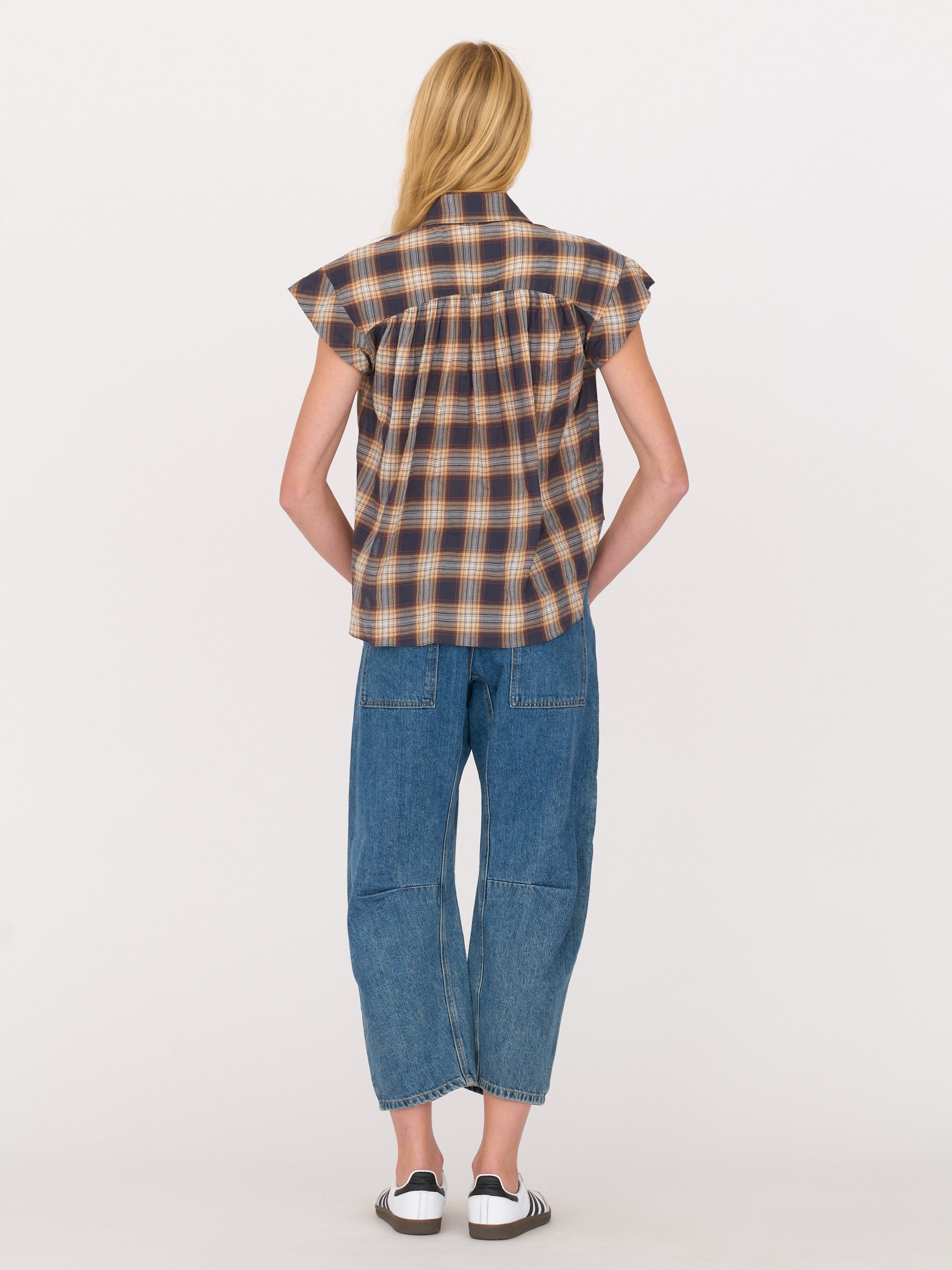 A relaxed, slightly rounded jean designed with a subtle barrel-leg shape. Features front and back patch pockets, soft knee seaming, and an easy cropped length that hits just above the ankle.