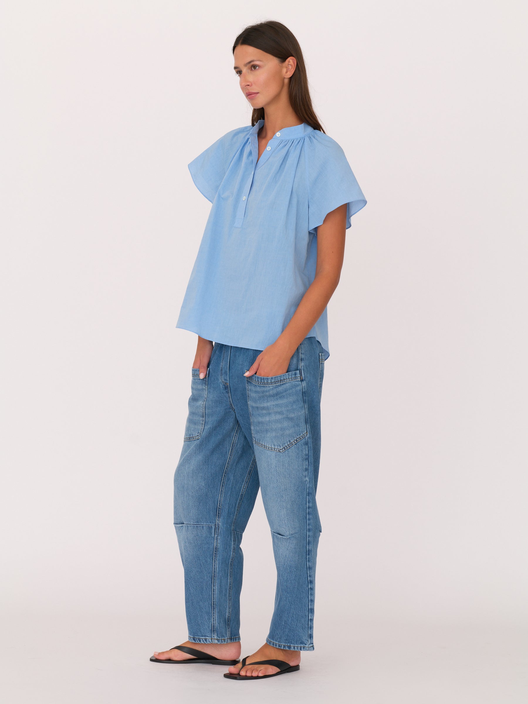 Our classic barrel-leg pant cut in a structured dark wash denim with an easy elastic waist and oversized patch pockets. Clean, modern, and effortlessly wearable.